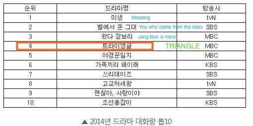 [INFO] 2014 Top 10 da quantidade total de Tweets de K-Drama:Drama de Kim Jaejoong - “Triangle” está em #4