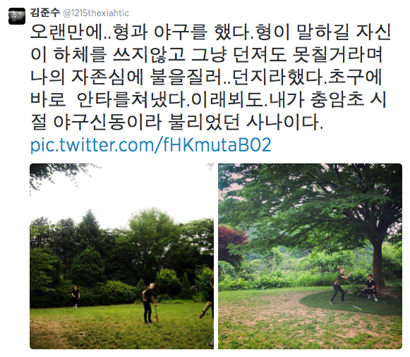 Depois de muito tempo... eu joguei baseball com o hyung (irmão). Ele disse que mesmo atire a bola (pitch) sem usar a força da parte de baixo do corpo, eu não iria acertar... fiquei com o orgulho em fogo. Eu disse para atirar e, eu acertei a bola no primeiro arremesso. Eu fui uma pessoa que já foi chama de "Prodígio do Baseball" durante os meus anos na Escola do Ensino Básico de Choongam.