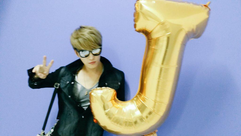 Nas selfies, o membro dos JYJ está a fazer uma cara séria, a olhar para longe da objectiva da câmara, enquanto dá um sinal fofo de vitória. Ele está a segurar um balão grande e de cor dourada, com a forma de um J, a sua inicial.