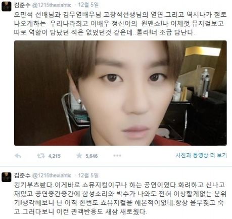 No passado dia 5 de Dezembro, Kim JunSu escreveu na sua rede social: “Foi uma actuação que me fez pensar ‘é assim que um musical show deve de ser.’Eu não sei se alguma vez desejei um papel especifico antes de ver o musical, mas Lola! Eu quero ser um pouco da tua pessoa”, e expressou o seu reflexo ao ver ‘Kinky Boots’.