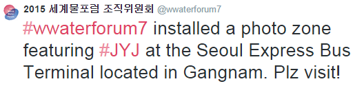 #wwaterforum7 instalou uma zona para fotos com os JYJ no Seoul Express Bus Terminal (Terminal de Autocarros Expressos de Seul) localizado em Gangnam. Por favor, visitem!