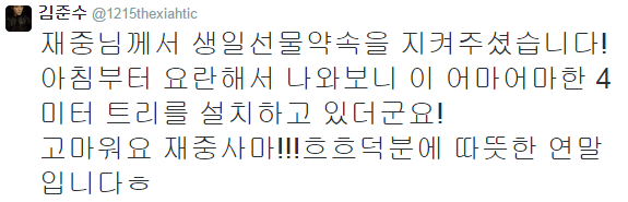 [TRAD] Jaejoong-nim manteve a sua promessa quanto a prenda de aniversário! Eu vim ver qual era a barafunda que estava acontecer e eles estavam a montar uma árvore de natal gigante de 4 metros de altura! Obrigada Jaejoong-sama!!! Hehe Graças a ti será uma temporada de final de ano calorosa! heh